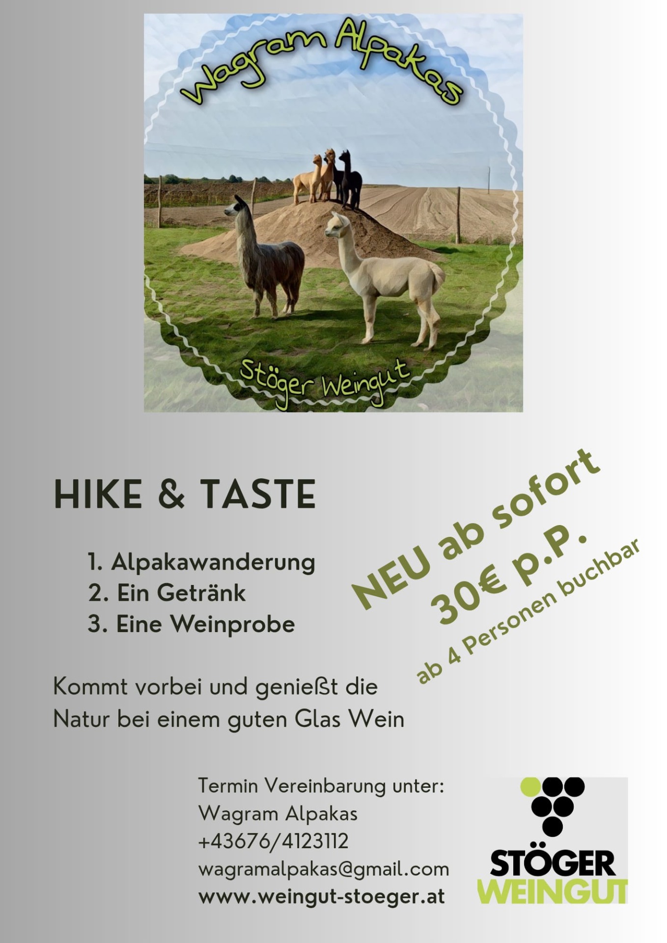 Nach einer Alpakawanderung könnt ihr euch für ein Getränk und eine Weinprobe eurer Wahl entscheiden.