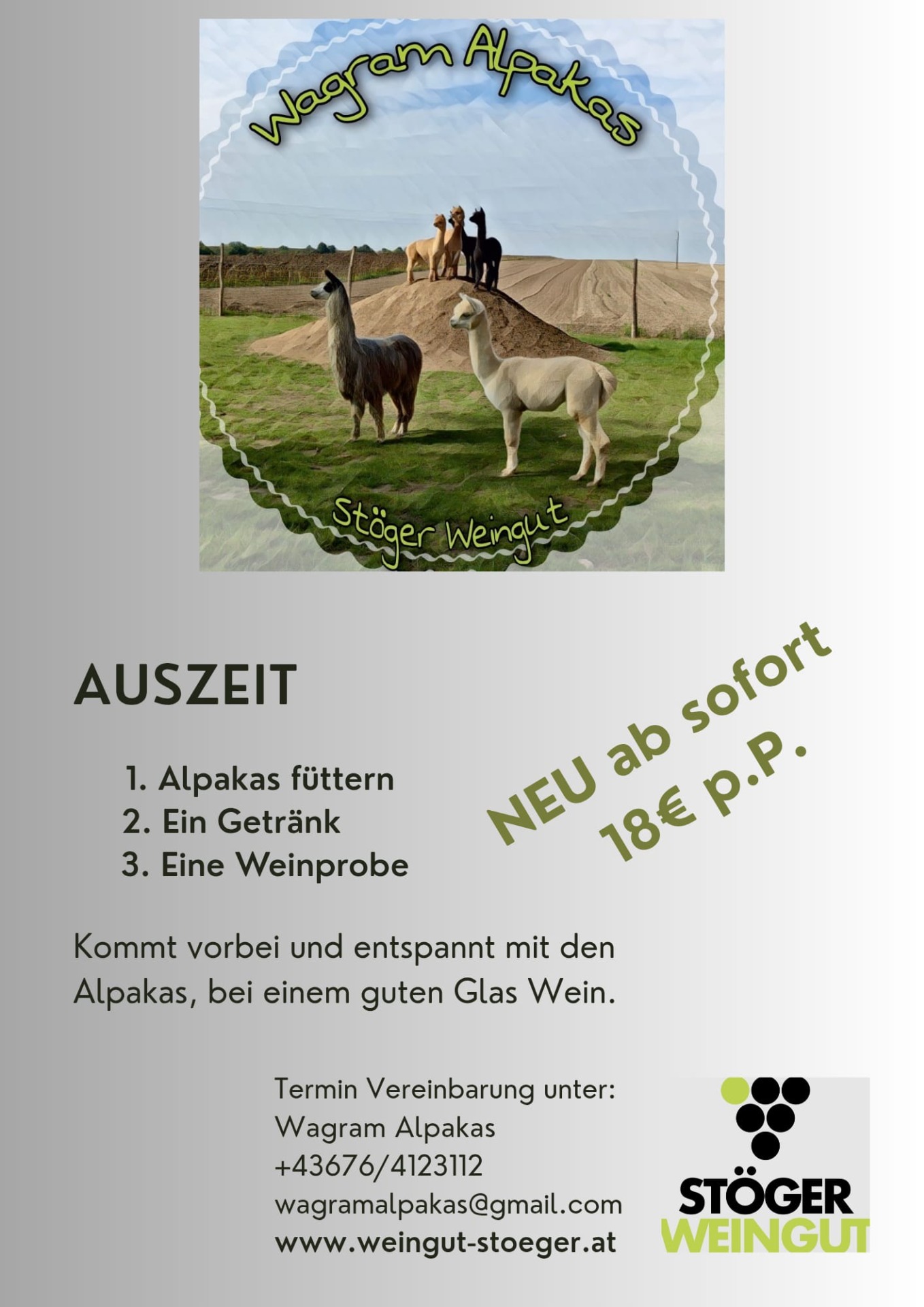 Hierbei könnt ihr die Alpakas füttern und anschließend ein Getränk und eine Weinprobe eurer Wahl auf unserem Bankerl genießen.